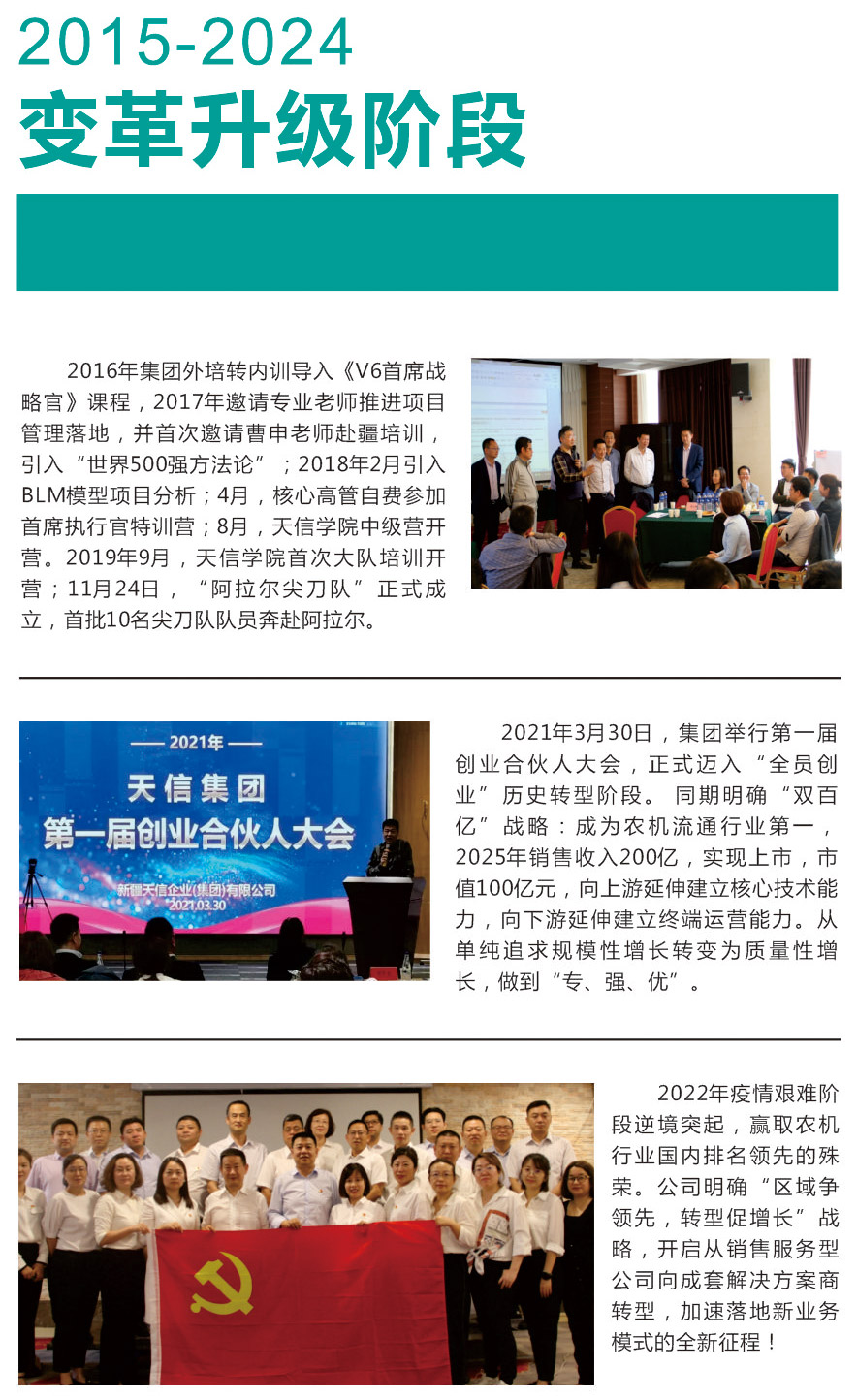 公司自2018年轉(zhuǎn)型升級以來,逐步從傳統(tǒng)的農(nóng)機銷售服務向成套農(nóng)業(yè)機械化解決方案商轉(zhuǎn)型,通過5年的變革發(fā)展,2022年公司進一步明確了戰(zhàn)略發(fā)展定位,打造“從耕種到收獲的全產(chǎn)業(yè)鏈綜合服務解決方案商”雙百億戰(zhàn)略的新目標。